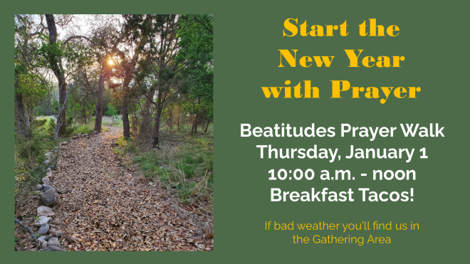 Thursday | January 1 | 10:00 a.m. - noonBeatitudes Prayer Walk Trailhead(blue storage container with mural)1604 Campus Start the New Year with...